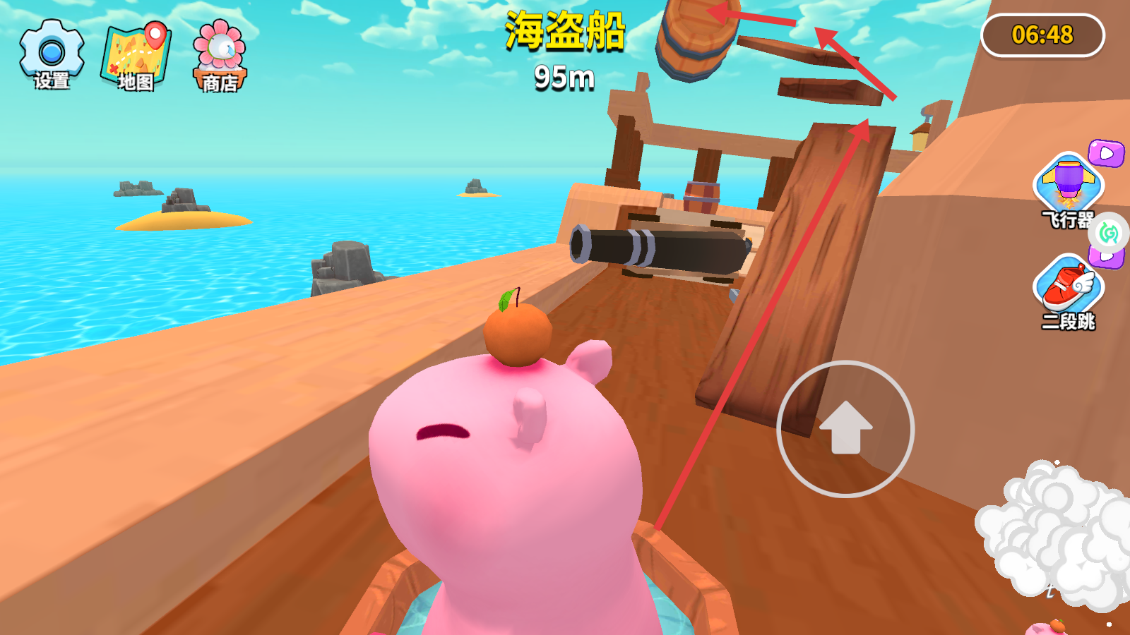 3、在【海盗船】内,注意上方摆动的木桶等机关,借助右侧向上按钮操控角色,继续向海盗船更深处探索。