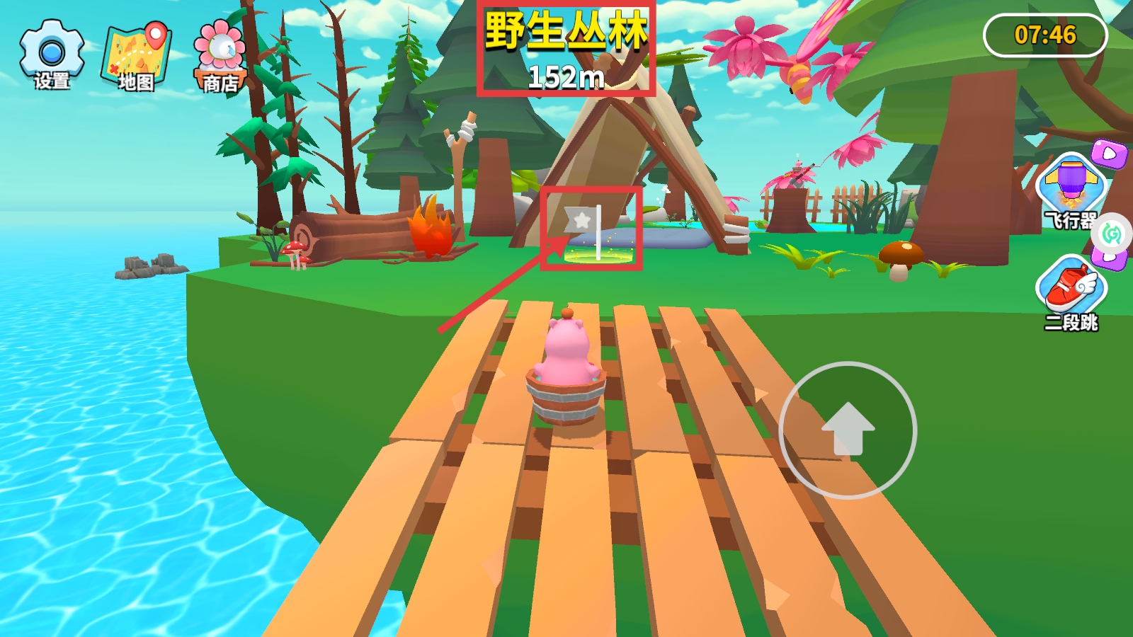 4、进入【野生丛林】场景,朝着带有旗帜的目标点前进,利用右侧向上按钮操控角色移动,开启丛林区域探索。