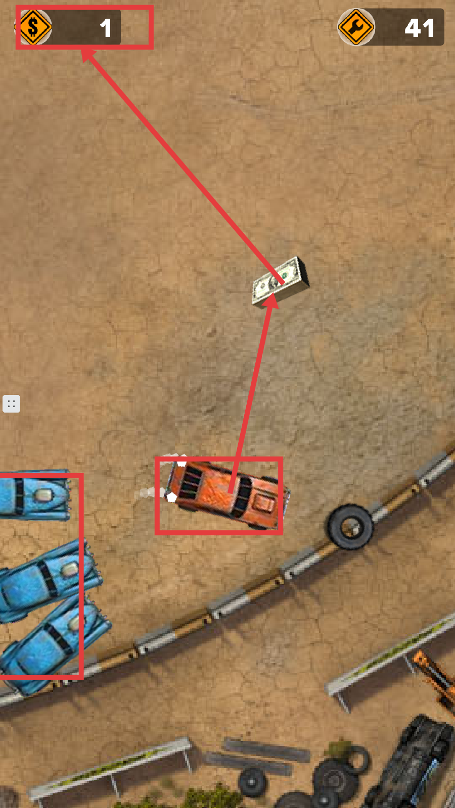 2、操控橙色车辆移动,优先收集场景中的美元道具,同时注意避开左侧的蓝色车辆群,逐步积累金币。