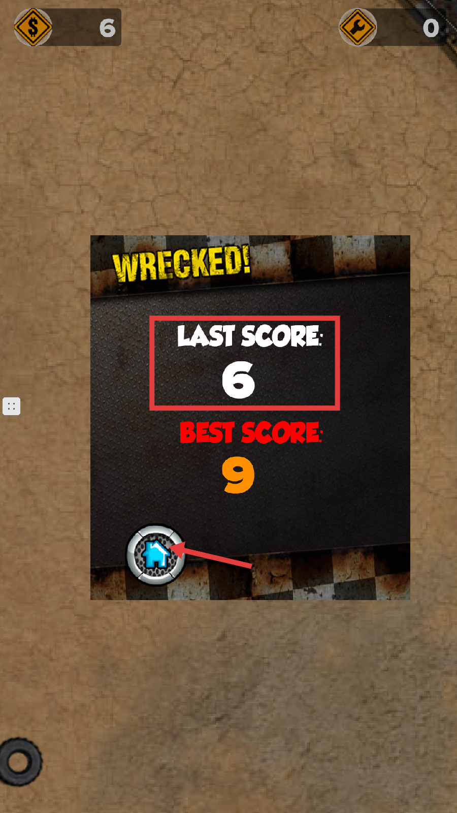 4、结算界面会显示【WRECKED!】及分数,查看【LAST-SCORE】和【BEST-SCORE】后,点击主页按钮可返回重新挑战。