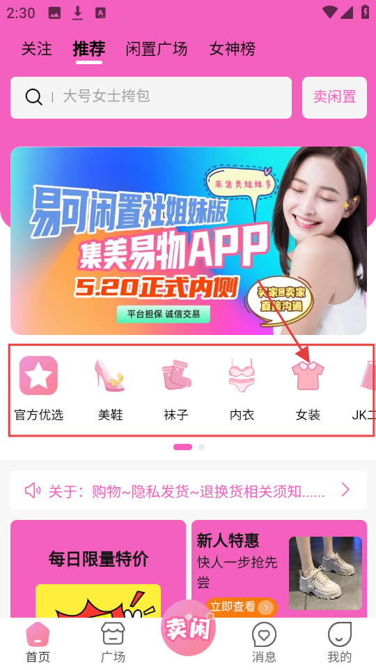 1、首页有【官方优选】【美鞋】等分类,想找女装,点【女装】分类,超方便。