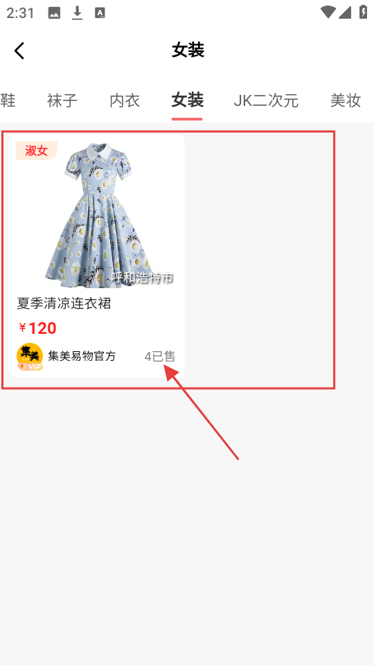 2、女装页有各类女装,看中【夏季清凉连衣裙】,点进去,看详情和价格。