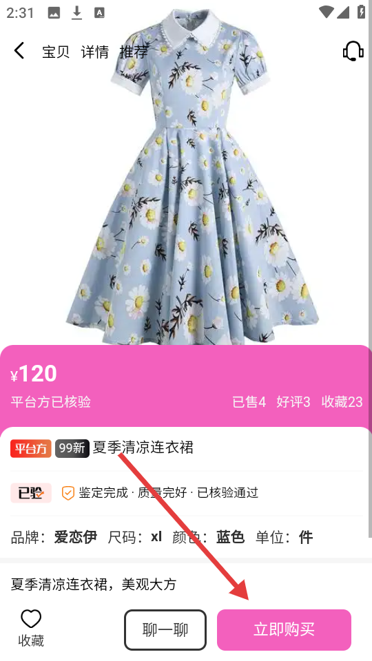 3、连衣裙详情页,确认尺码、颜色等,要是满意,点【立即购买】,准备下单。