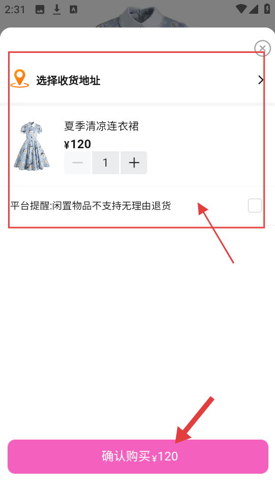 4、下单时选收货地址,确认商品数量,看清平台提醒,点【确认购买】,完成下单。