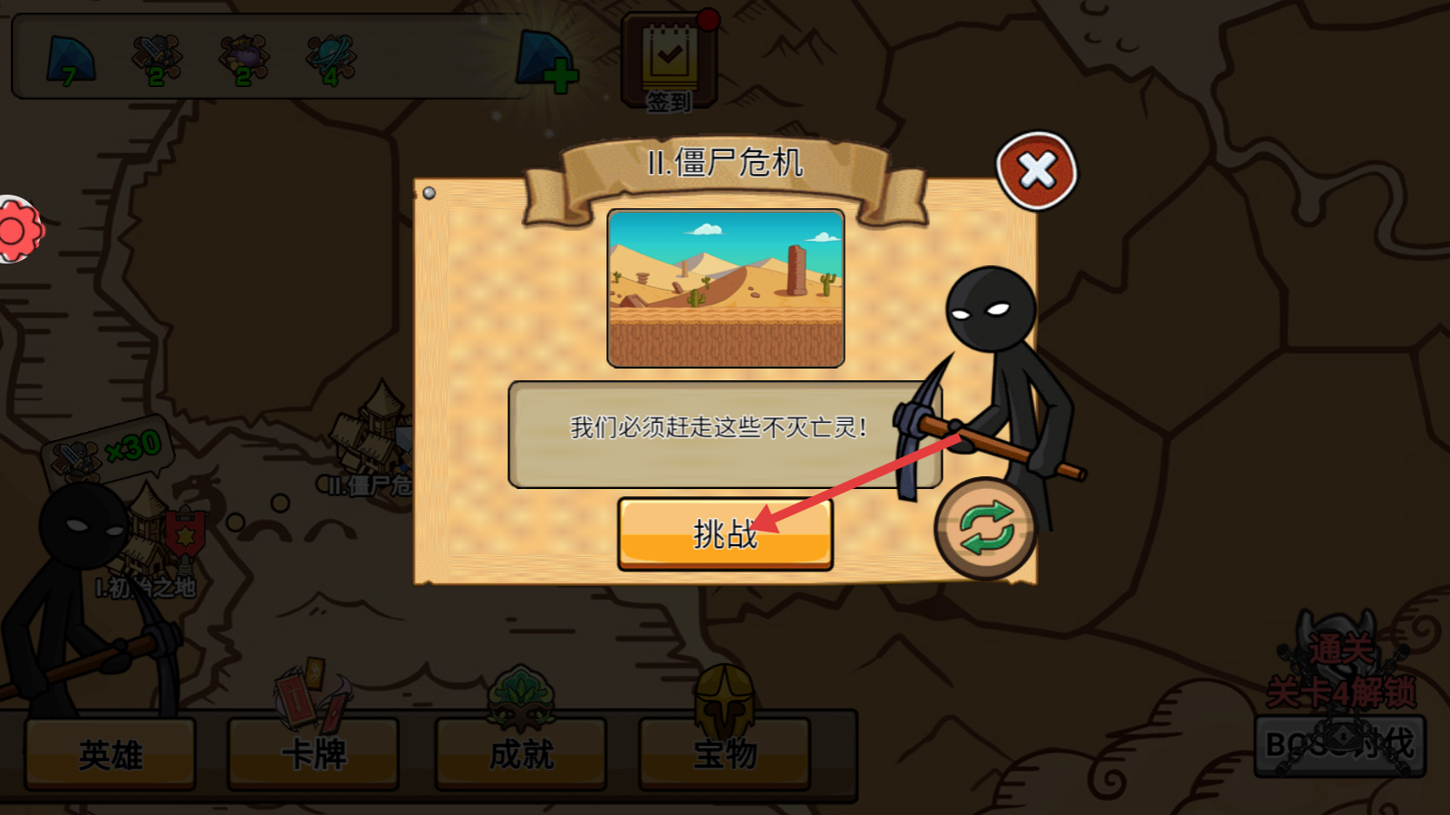 1、遇到【II.僵尸危机】关卡时,点击“挑战”按钮进入沙漠场景的僵尸抵御战,准备迎战不灭亡灵。