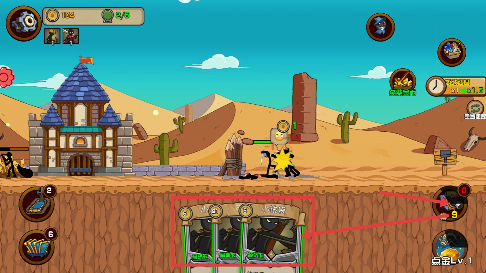 2、战斗中利用“经济卡”“军事卡”等卡牌,快速积累金币资源,为召唤作战单位和升级建筑提供资金。