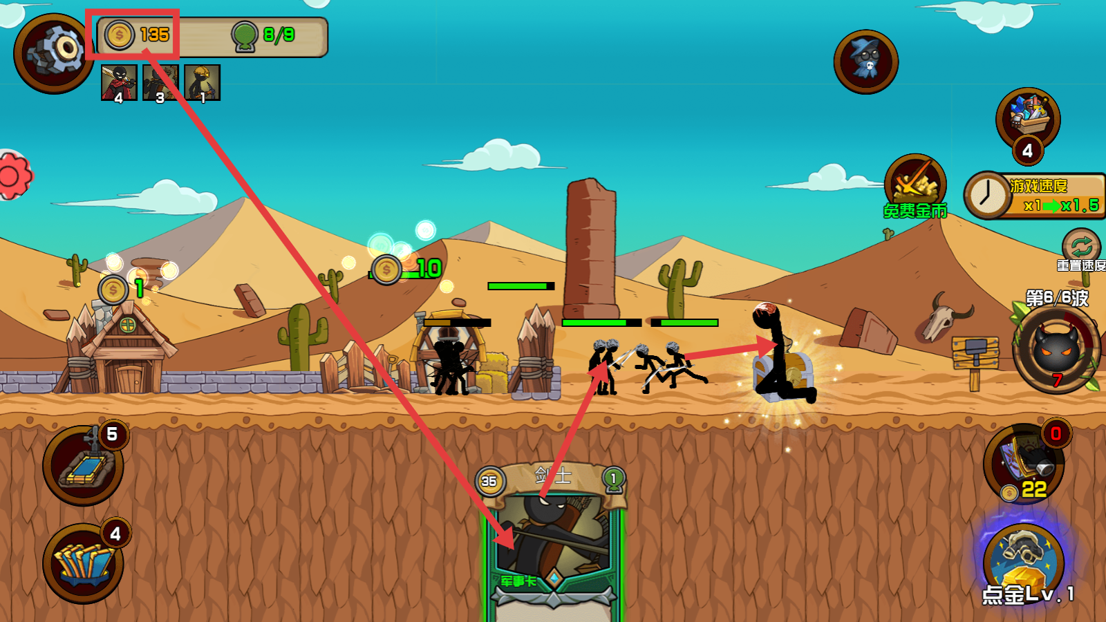 3、消耗金币召唤“剑士”等军事单位,让其在战场对抗僵尸,同时留意击杀僵尸获得的金币奖励,持续强化战力。