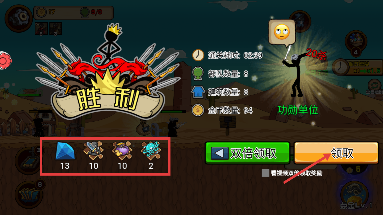 4、成功通关后,点击“领取”按钮获取钻石、武器道具等奖励,这些资源可用于后续关卡的战力提升。