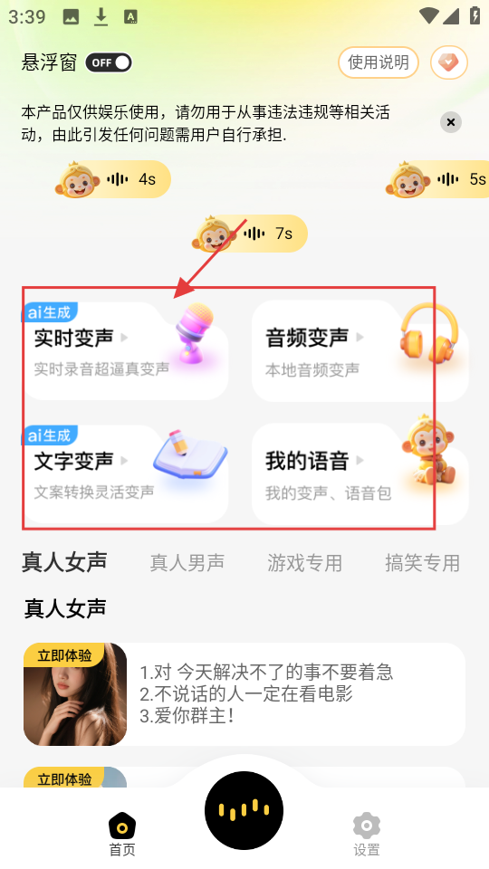 1、首页有【实时变声】【音频变声】等功能,想实时变声,点【实时变声】,体验超逼真变声。