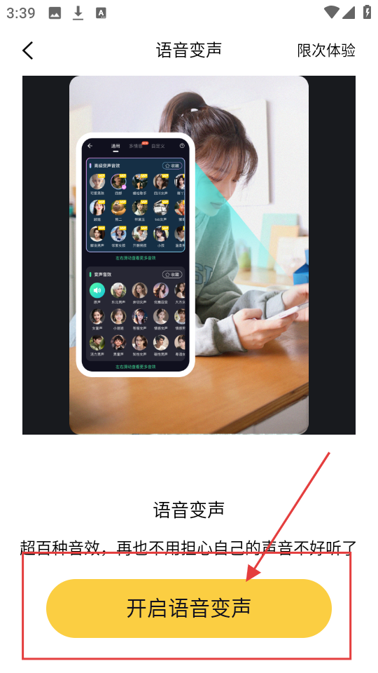 2、语音变声页,有超百种音效,点【开启语音变声】,再也不用担心自己声音不好听啦。