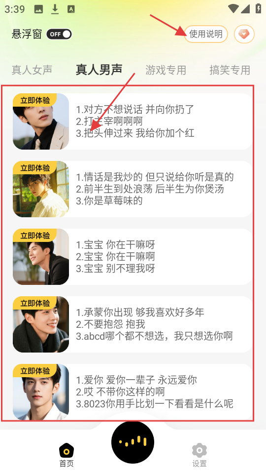 3、真人男声分类里有不少有趣语音,看中喜欢的,点【立即体验】,感受不同语音效果。