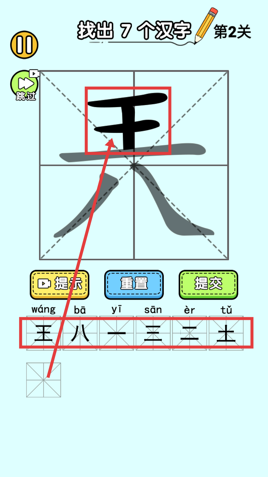 3、继续从文字结构里挖掘,还能找到“一”“三”“二”“土”等汉字,将找到的汉字填入下方格子。