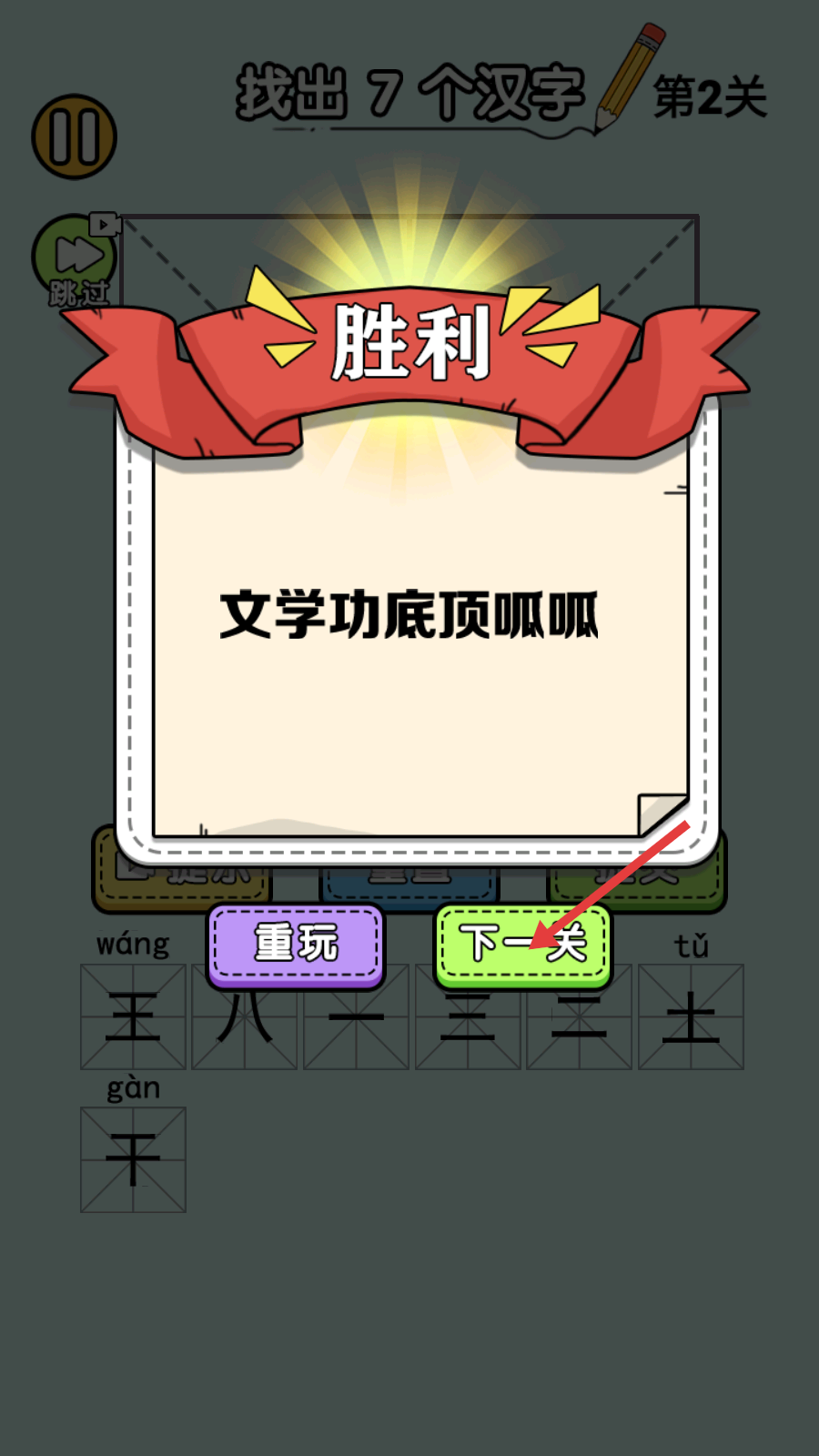 4、成功找出所有要求的汉字后,界面会显示【胜利】,此时点击【下一关】,就能继续挑战新的文字查找关卡。