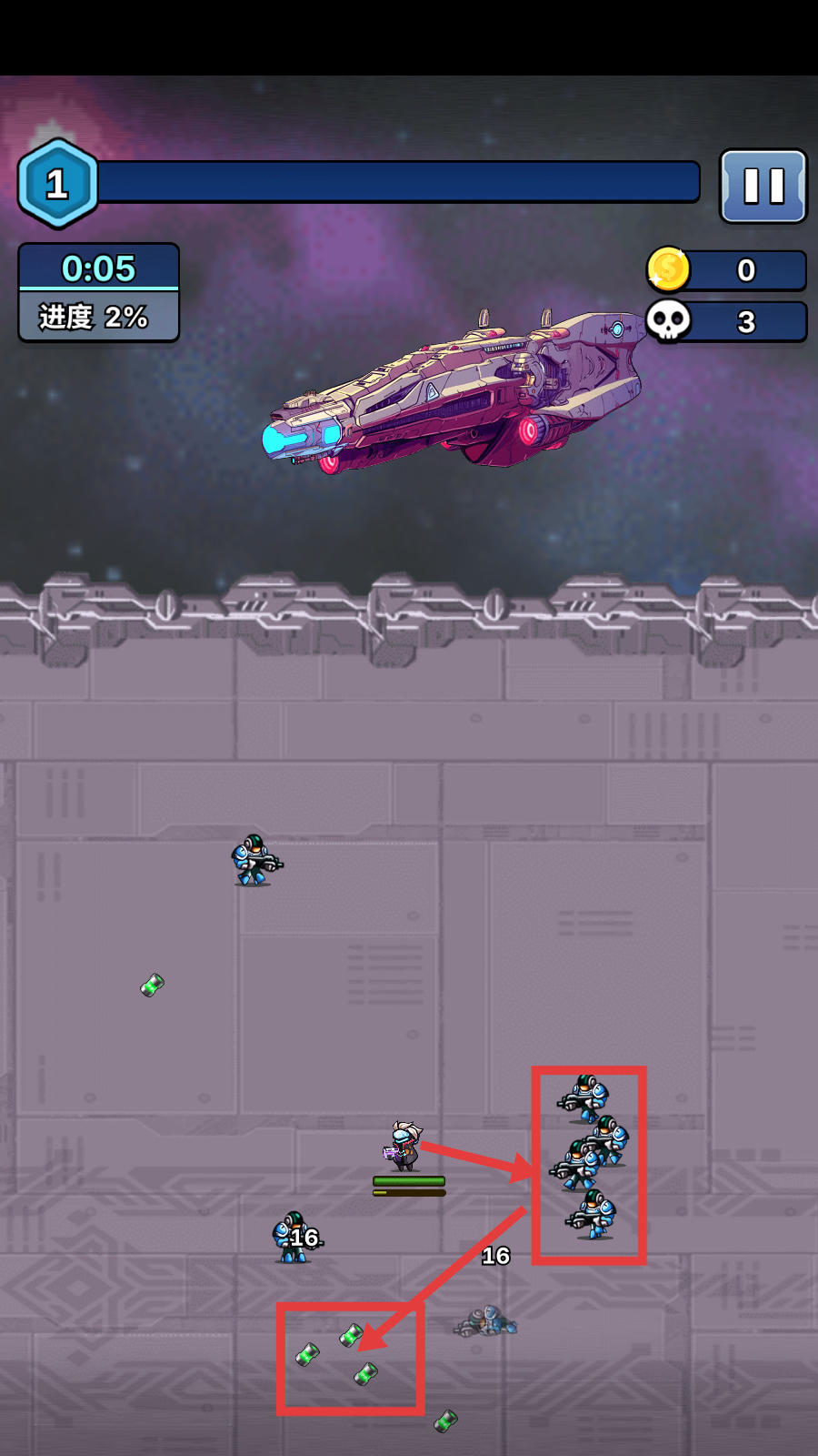 2、战斗中操控角色攻击敌人,同时收集场景内的绿色道具,消灭敌人可推进进度并获取奖励。