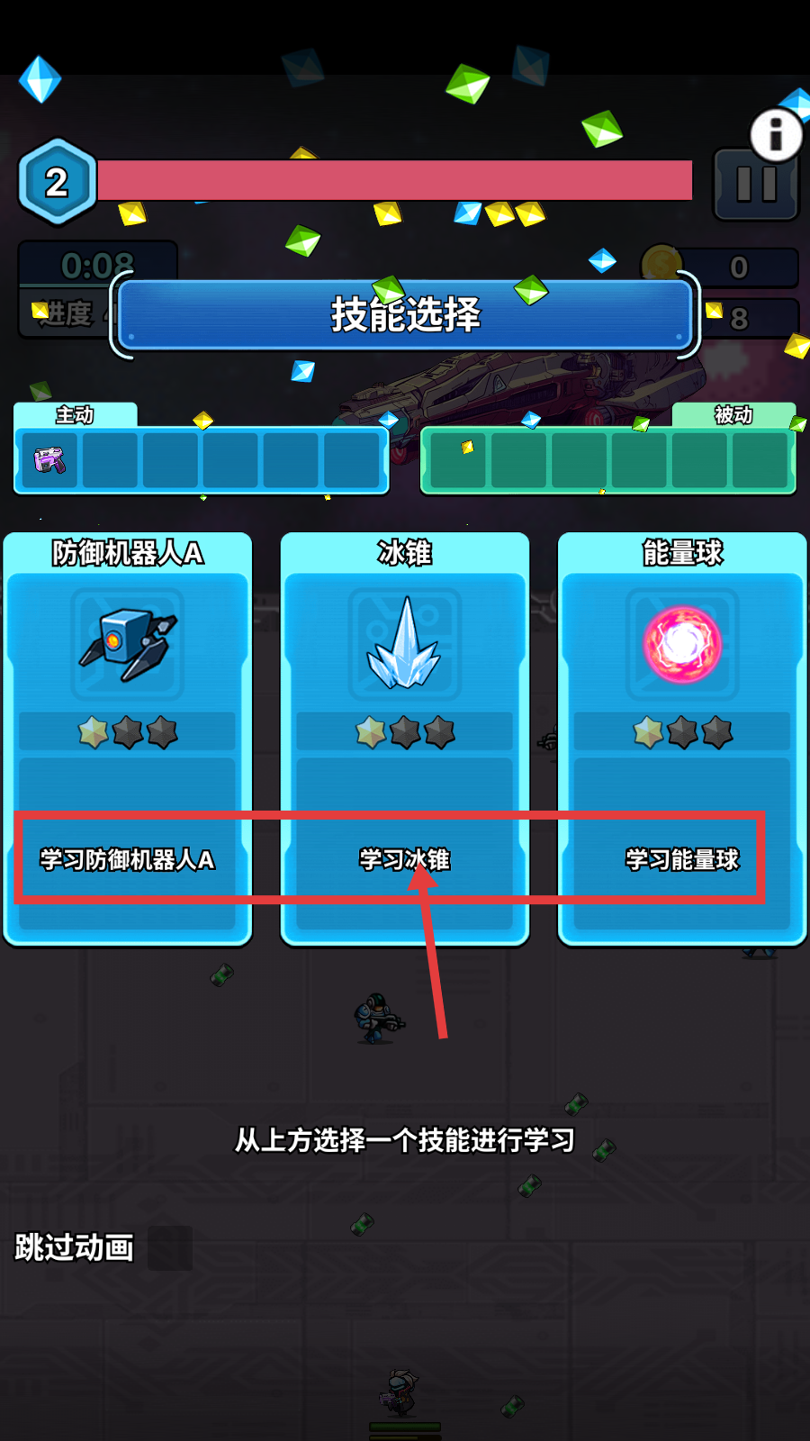 3、升级时在【技能选择】界面,可从【防御机器人A】【冰锥】【能量球】中选一个技能学习,增强战斗能力。