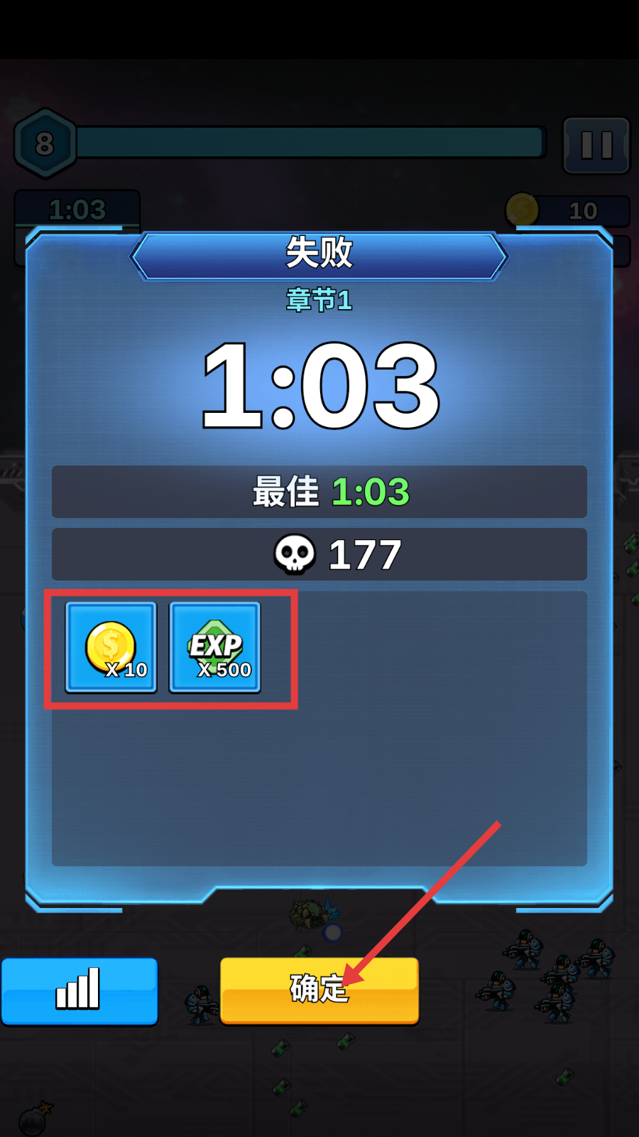 4、若战斗失败,界面会显示获得的金币和经验奖励,点击【确定】按钮后可重新挑战或提升战力再尝试。
