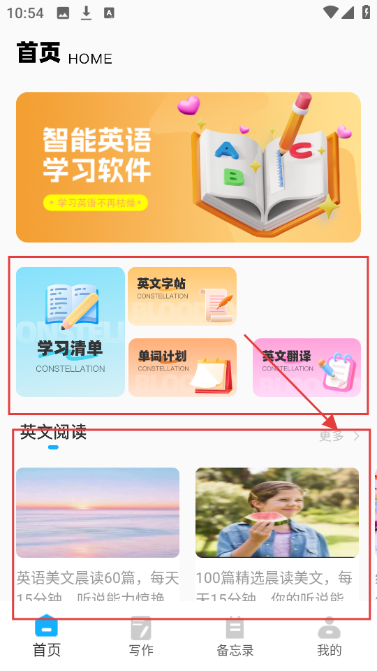 1、首页有【学习清单】【英文字帖】等功能,还有英文阅读板块,想提升英语从这儿选入口。