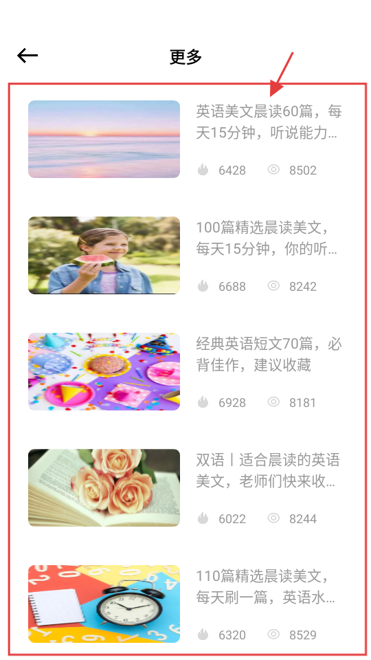 2、英文阅读“更多”页有不少美文,像【英语美文晨读60篇】,挑感兴趣的点进去学习。