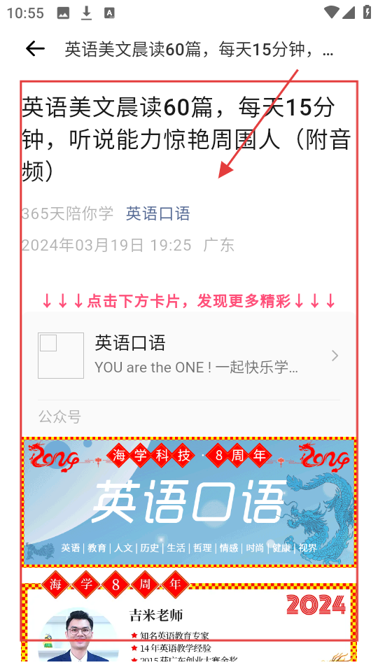 3、进入文章详情页,能看到内容和相关推荐,跟着学习,听说能力能慢慢提升。