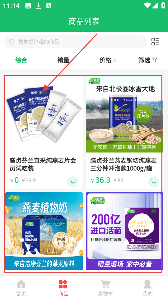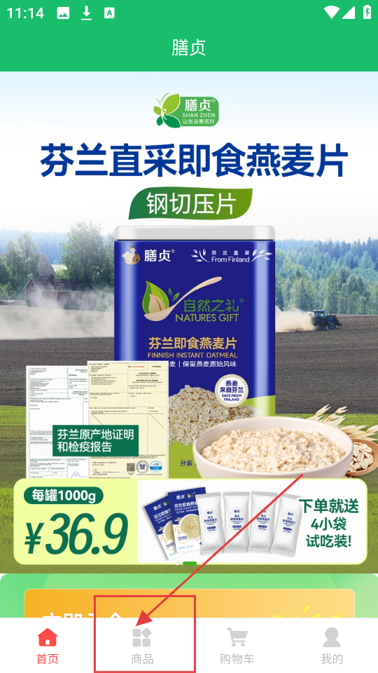 1、首页有芬兰直采即食燕麦片展示,想选商品,点底部【商品】入口,能看到更多商品。
