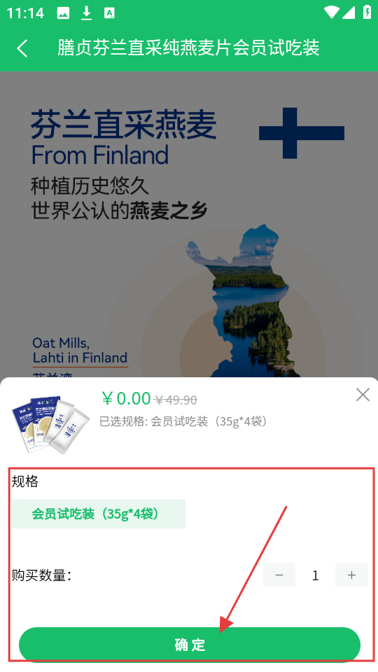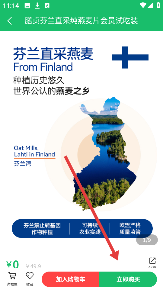3、进入商品详情页,了解芬兰直采燕麦详情,若要购买,点【立即购买】选规格数量。