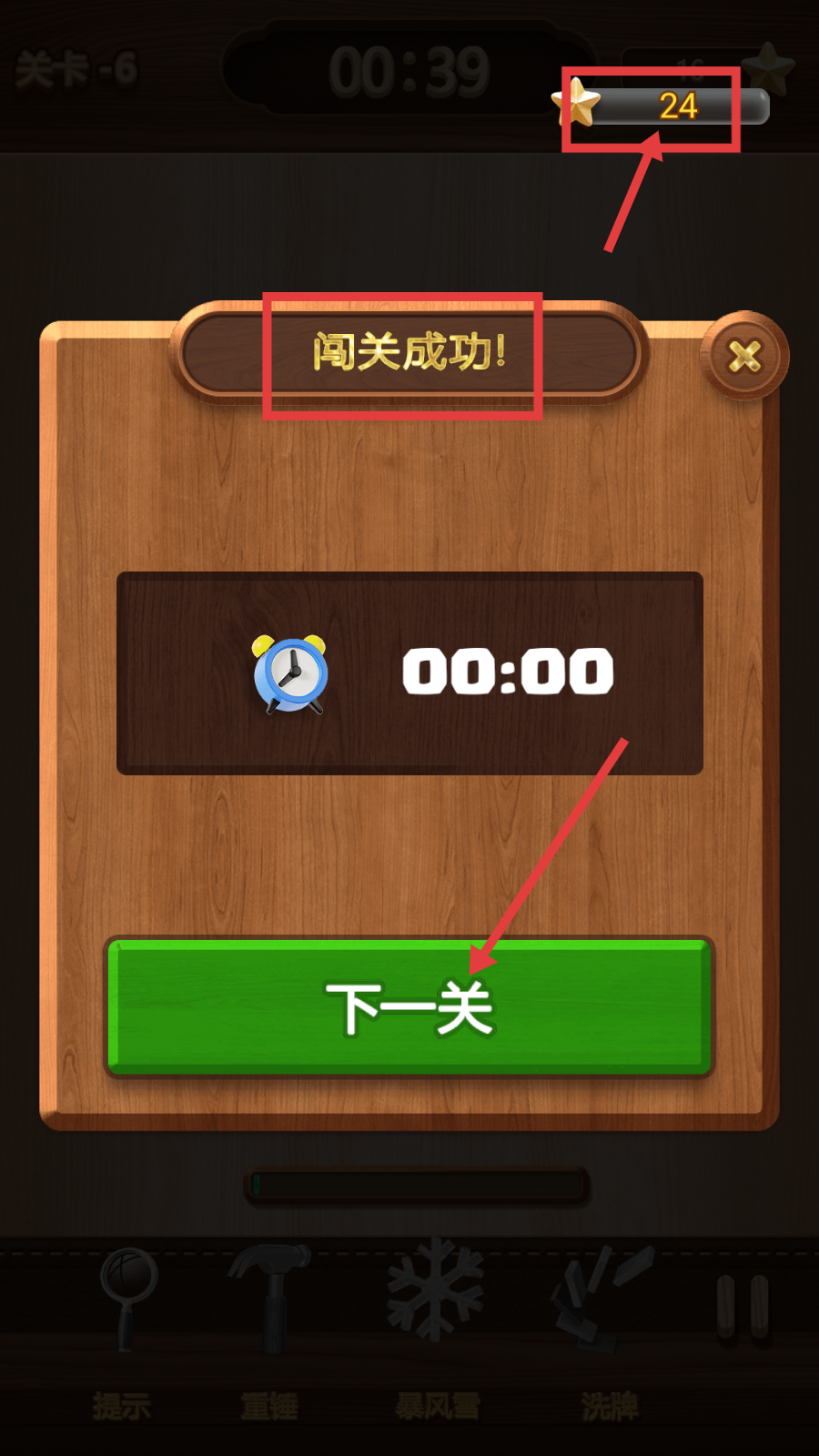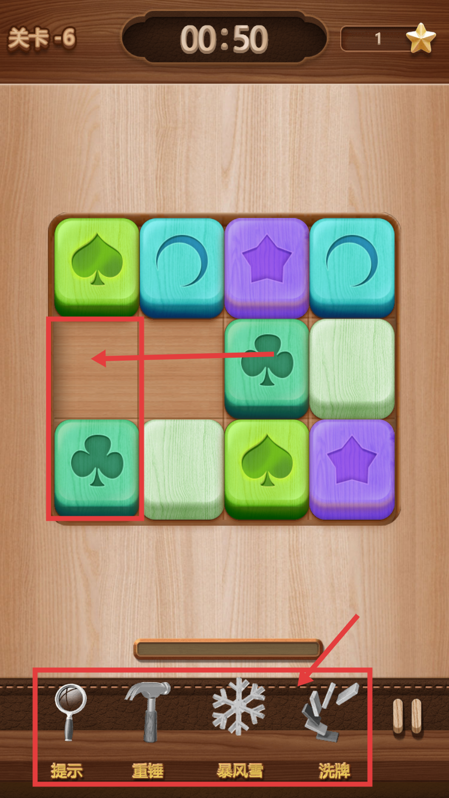 2、进入第6关后,观察带有相同图案的方块,利用下方【提示】【重锤】等道具,辅助配对消除方块。