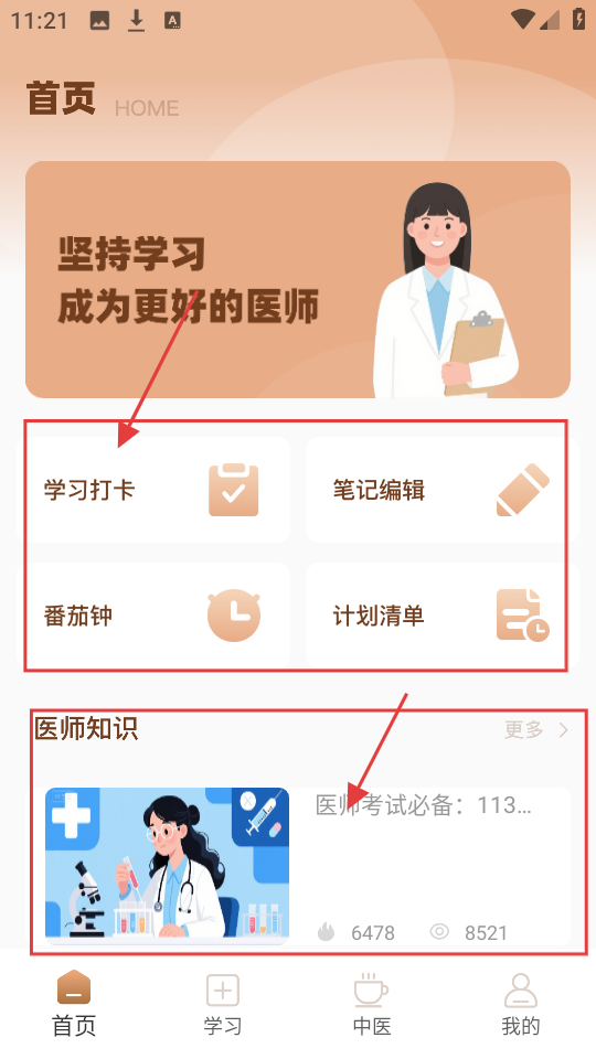 1、首页有【学习打卡】【笔记编辑】等功能,还有医师知识板块,想学习就从这儿选入口。