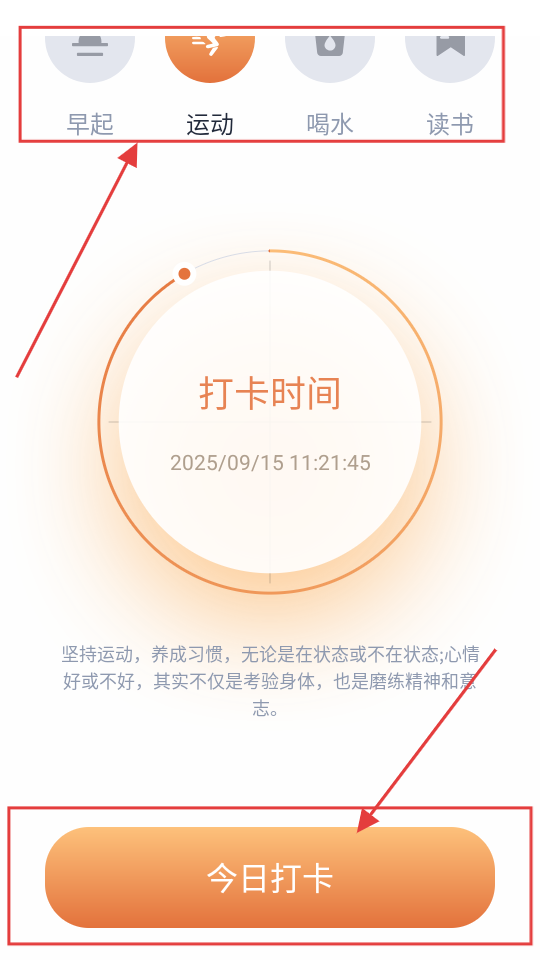 2、打卡页能选早起、运动等打卡类型,选好后点【今日打卡】,就能记录打卡啦。