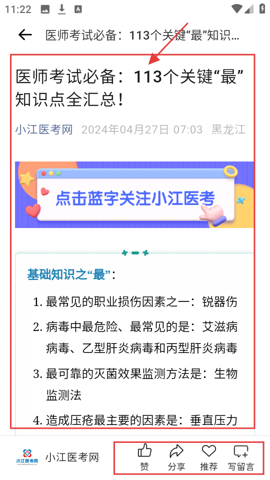 4、医师知识文章里有考试必备知识点,学习后还能点赞、分享,和大家交流学习心得。