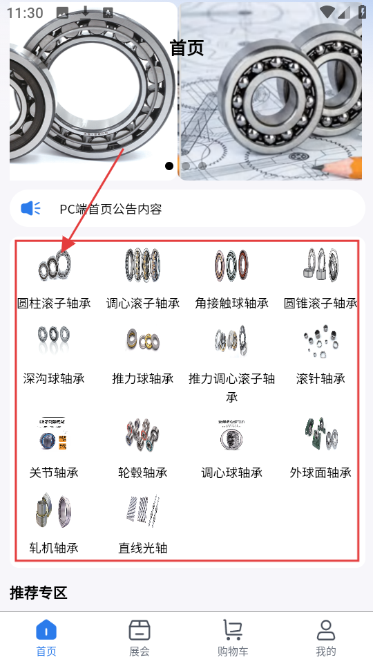 1、首页有多种轴承类型,像【圆柱滚子轴承】【调心滚子轴承】等,想选轴承从这儿挑超方便。