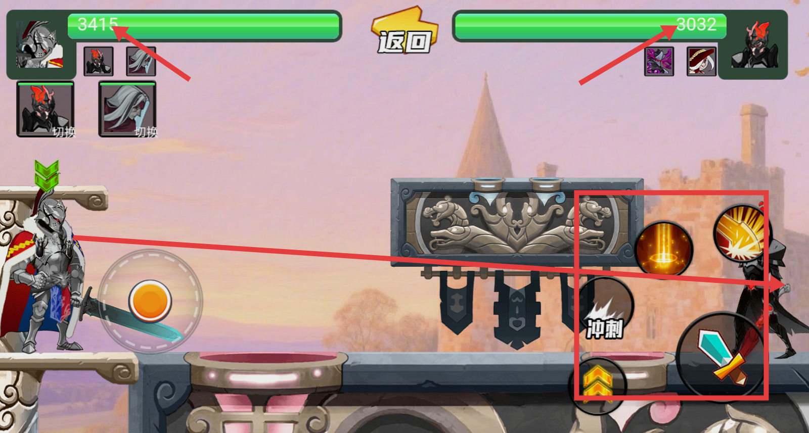 3、战斗过程里,运用右侧的技能(像冲刺、武器攻击等)攻击对手,同时关注双方的血量条,进行策略性战斗。
