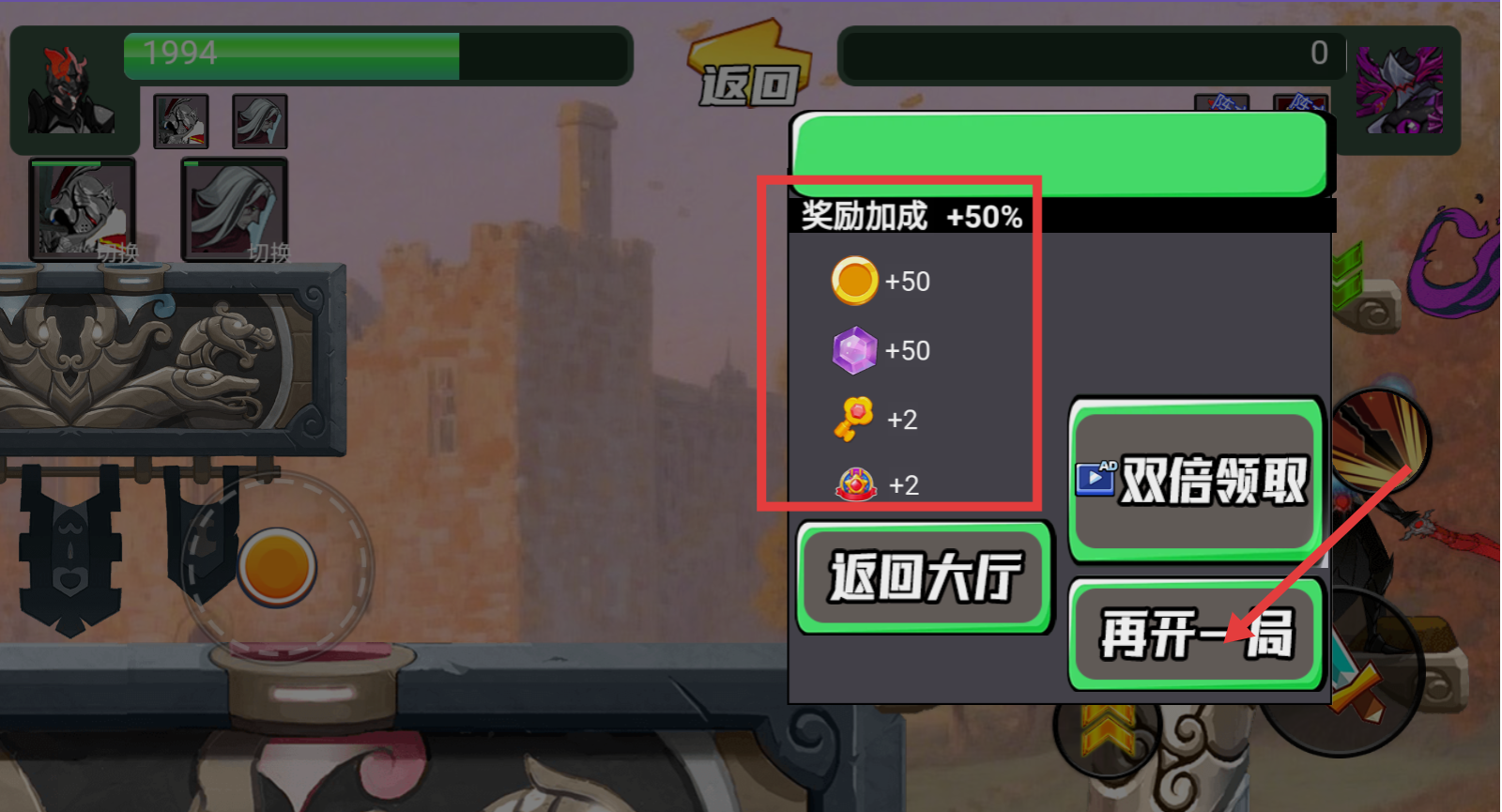 4、战斗结束后,能获得金币、紫晶等奖励,若想继续挑战,点击【再开一局】按钮,开启下一场对战。