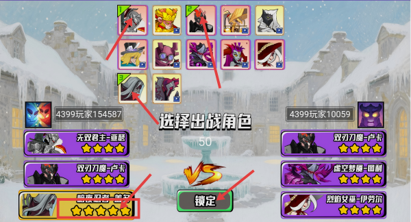 2、进入选择出战角色界面,挑选星级高的角色,选定后点击【锁定】按钮,确认出战角色。