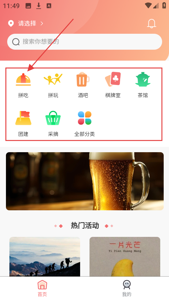 1、首页有【拼吃】【拼玩】等分类,还有热门活动,想找活动从这儿选入口很方便。