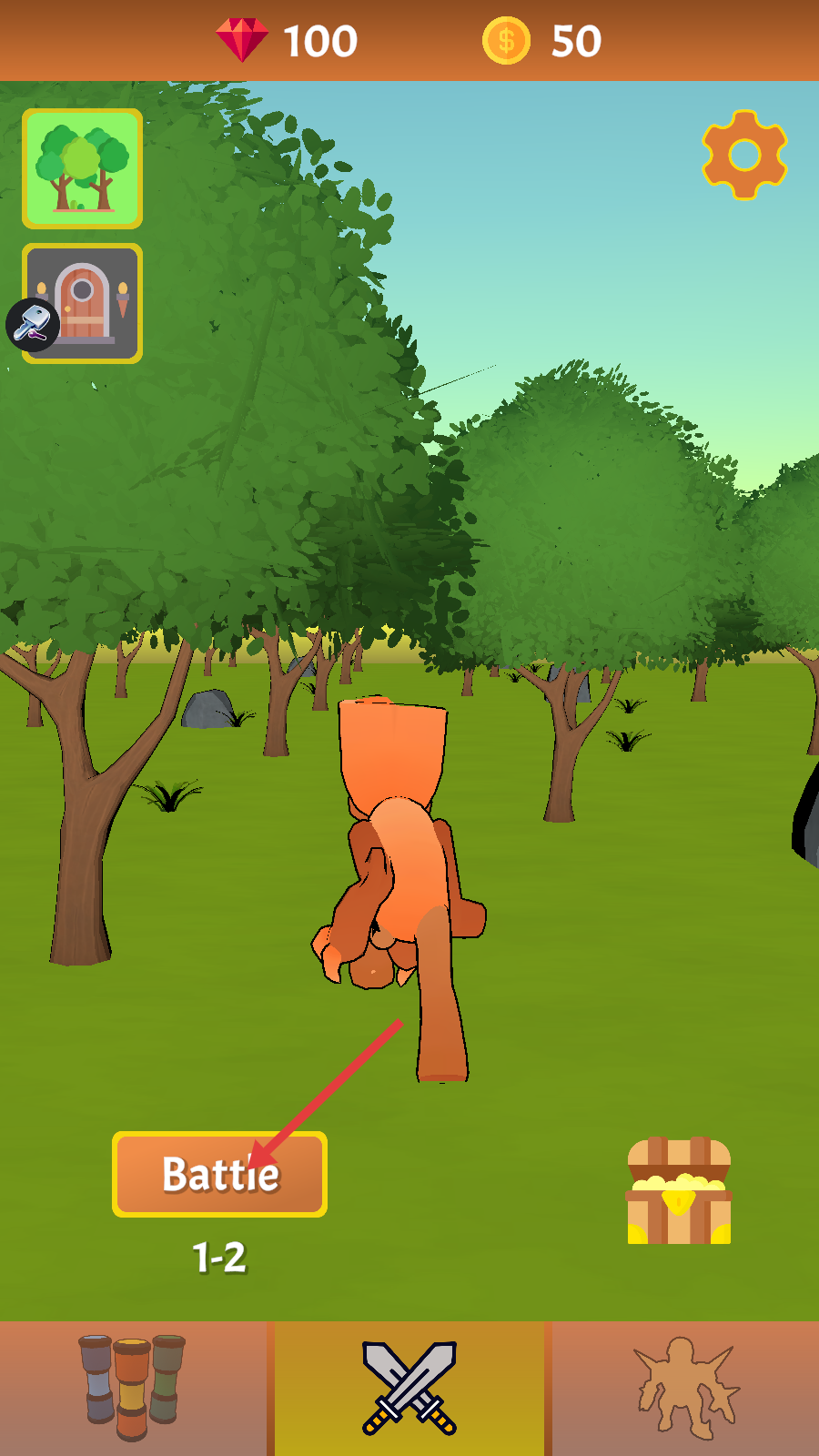 1、进入【Battle-1-2】关卡前,先留意顶部【钻石-100】和【金币-50】数量,点击按钮即可开启战斗,熟悉关卡入口很重要。