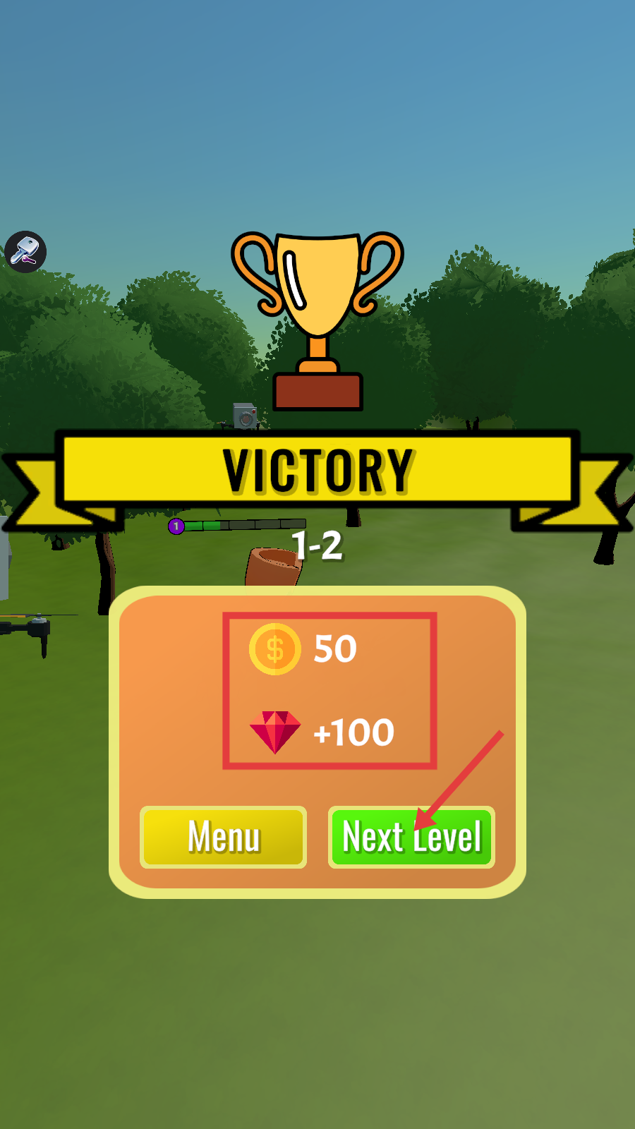 4、成功通关后,可获得【金币-50】和【钻石-+100】奖励,点击绿色【Next-Level】按钮就能进入下一关,继续挑战。