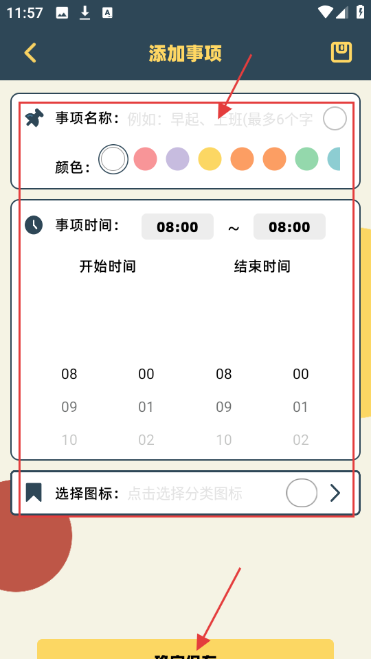 2、添加事项页填事项名称、选颜色和时间,设置好后,就能保存事项,管理日程啦。