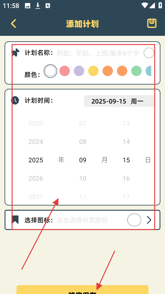4、添加计划页填计划名称、选颜色和时间,设置好后,就能保存计划,规划每日安排。