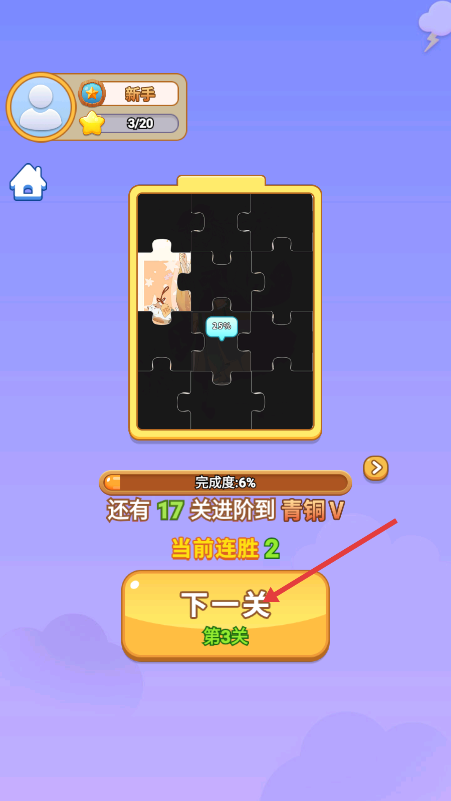 1、查看【新手】等级与【星星-3/20】进度,留意拼图完成度6%,点击【下一关-第3关】,进入液体分类新关卡。
