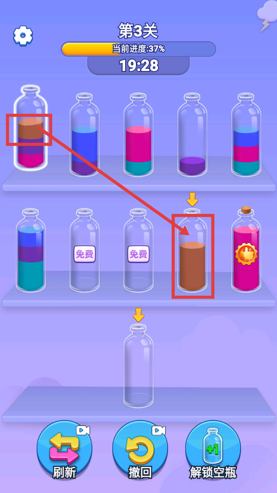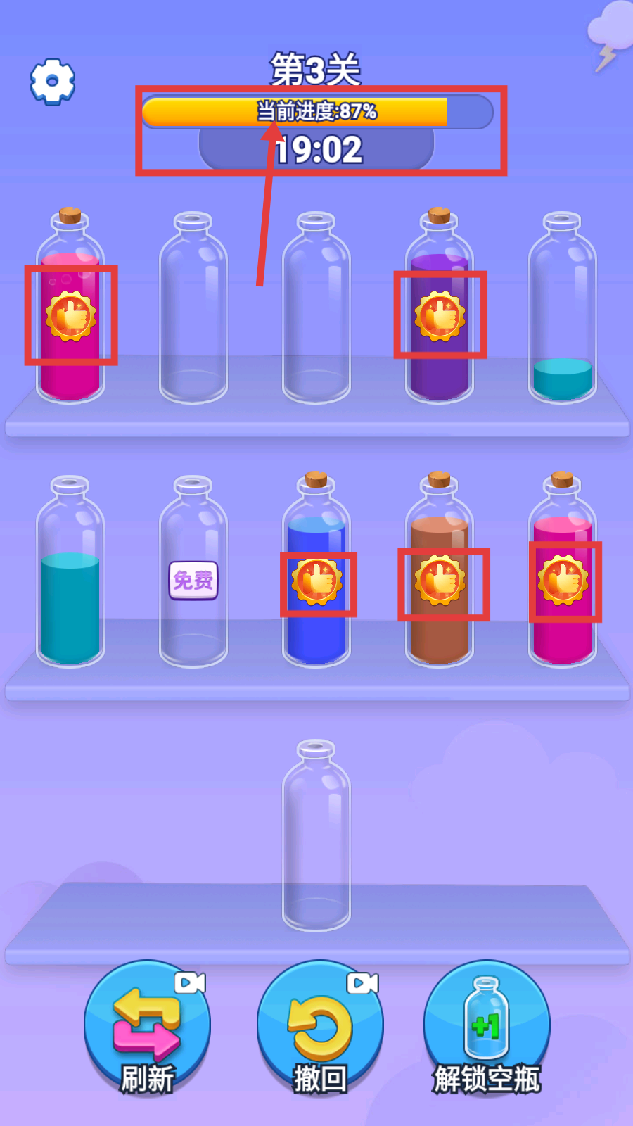 3、分类时借助【刷新】【撤回】功能调整,让相同颜色液体归瓶,随着操作推进,进度条会逐步提升。