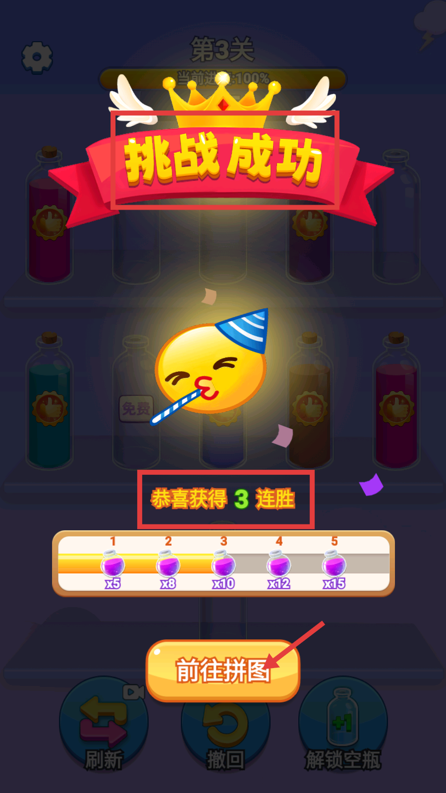 4、成功通关【第3关】后,获得【3-连胜】奖励,点击【前往拼图】按钮,继续推进拼图的解锁进度。