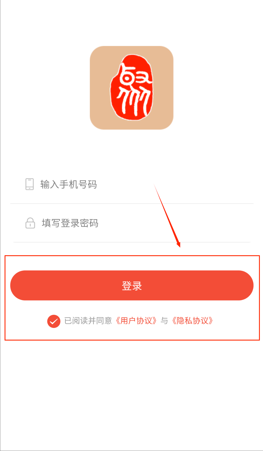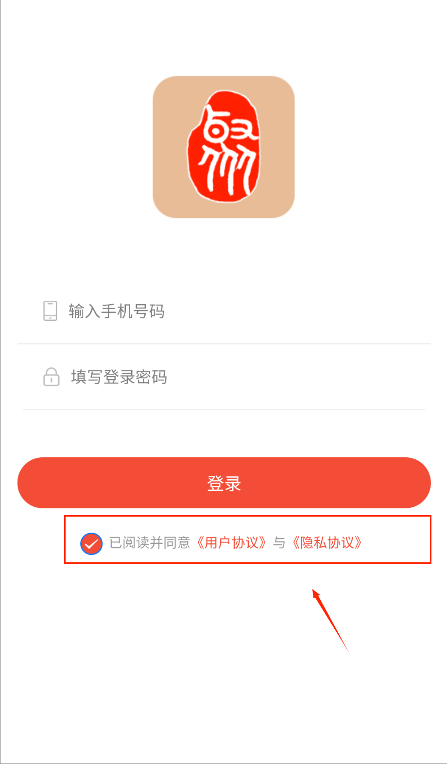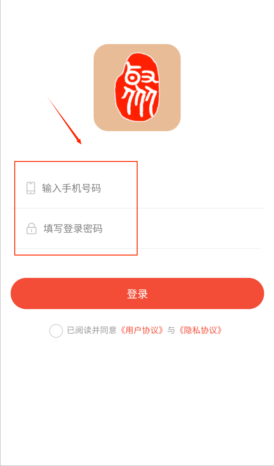 2、 打开软件进入登录界面后,注意顶部那个红色印章图案的标识,在手机号输入框准确填写号码,再在下方密码栏输入登录密码。