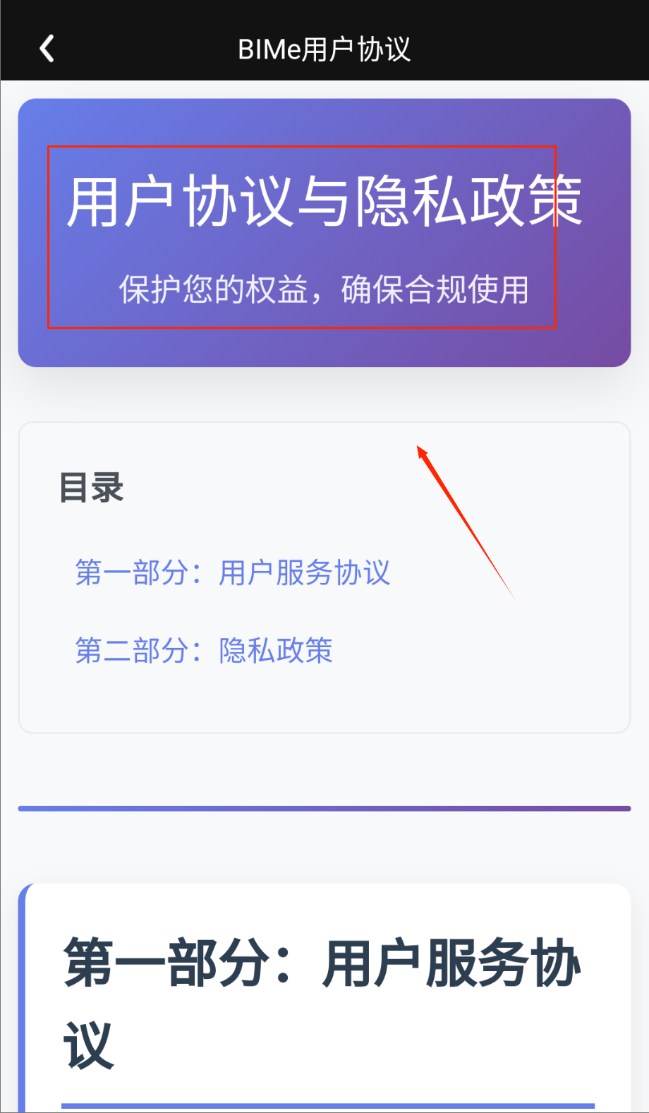 1、 打开BIMe应用后,首先会遇到用户协议界面呢,别急着跳过,花点时间看看“用户服务协议”和“隐私政策”的内容,了解自己的权益。