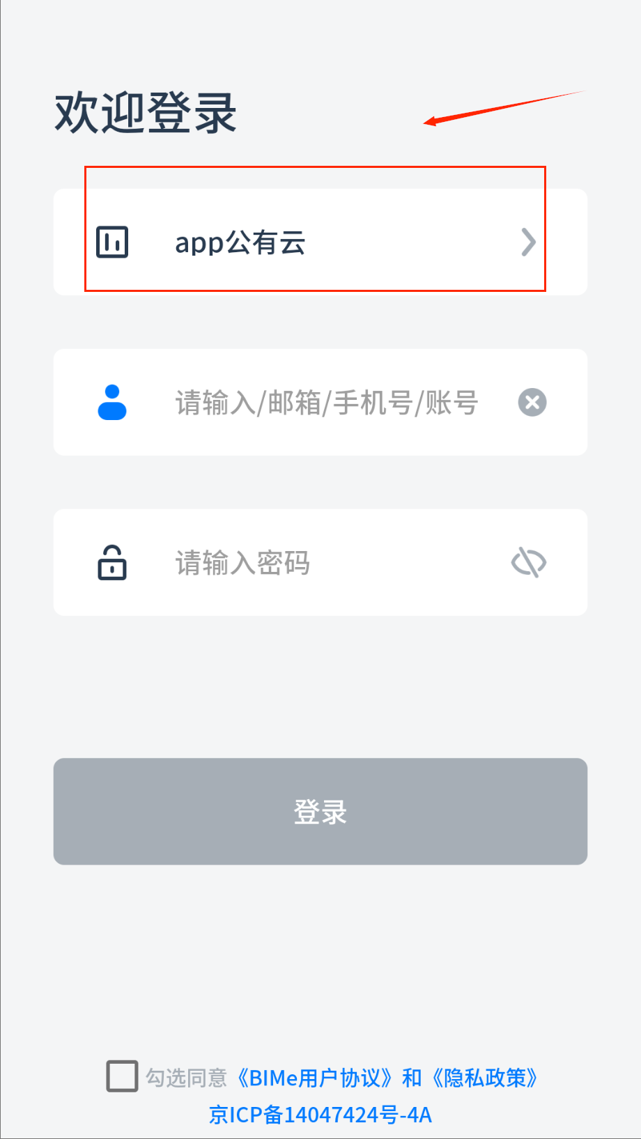 3、 登录软件时,先在登录界面顶部选择“app公有云”或其他适合的登录环境,然后在“请输入/邮箱/手机号/账号”框里填好账号。