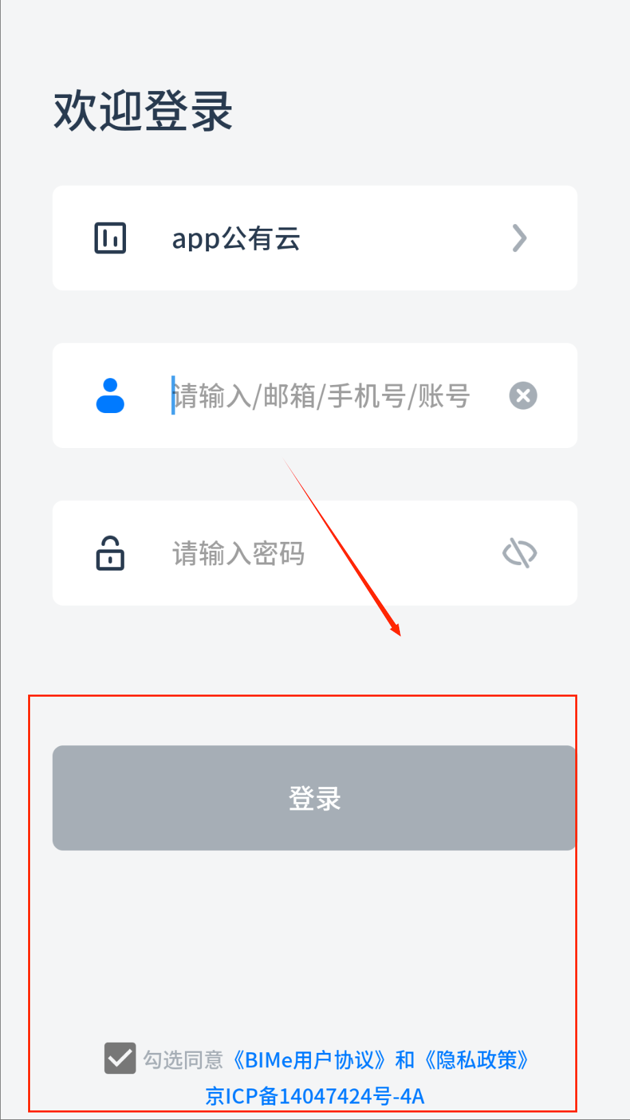 4、 登录前别忘了勾选同意下方的“BIMe用户协议”和“隐私政策”,然后点击灰色的“登录”按钮完成登录操作,登录成功后可以开始使用软件。