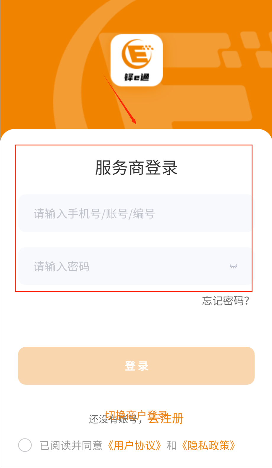 3、 服务商登录超方便哟,打开APP在“请输入手机号/账号/编号”框填注册信息,密码框输密码时可点右侧眼睛图标检查。