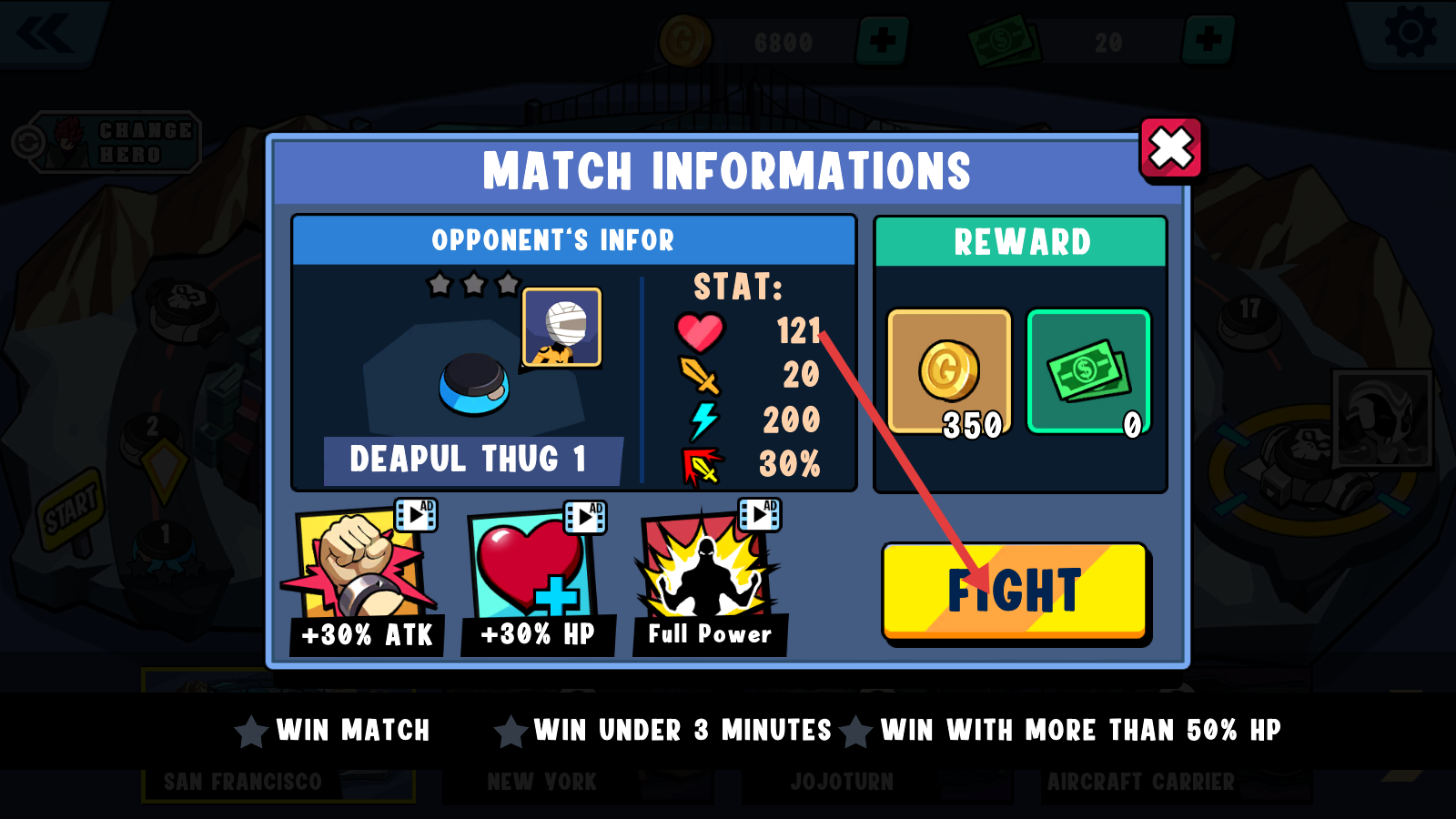 1、对战前查看【MATCHINFORMATIONS】,了解对手【DEAPULTHUG1】的属性与奖励,点击黄色【FIGHT】按钮即可开启战斗。
