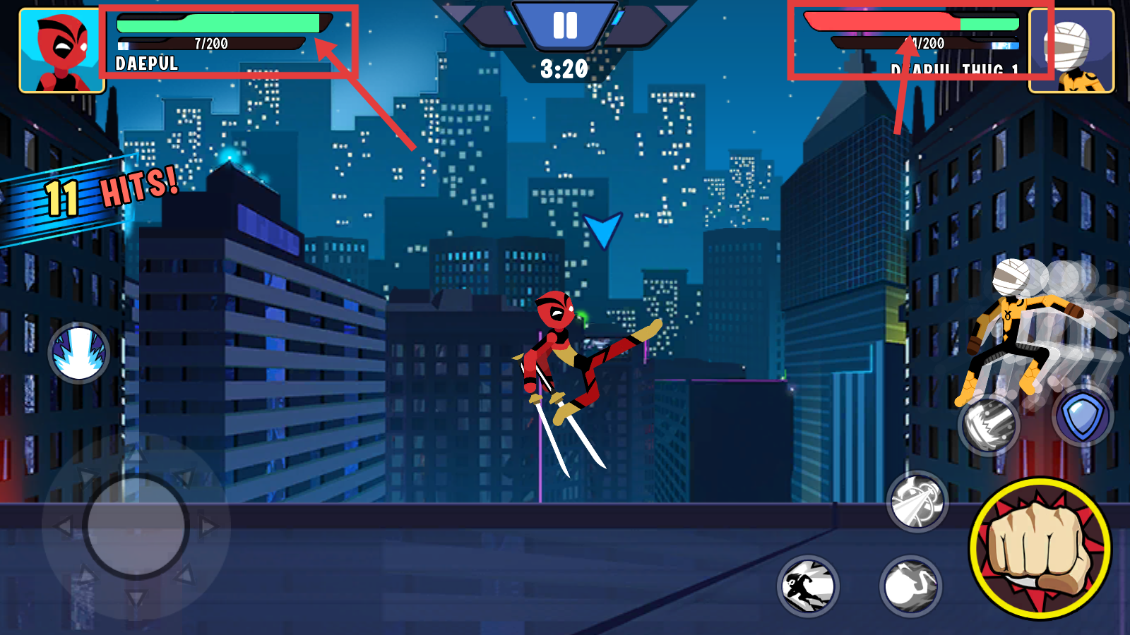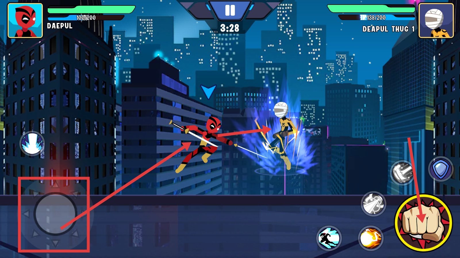 2、战斗时,用左侧摇杆控制角色移动,点击右侧拳头等技能按钮,向对手【DEAPULTHUG1】发起攻击。