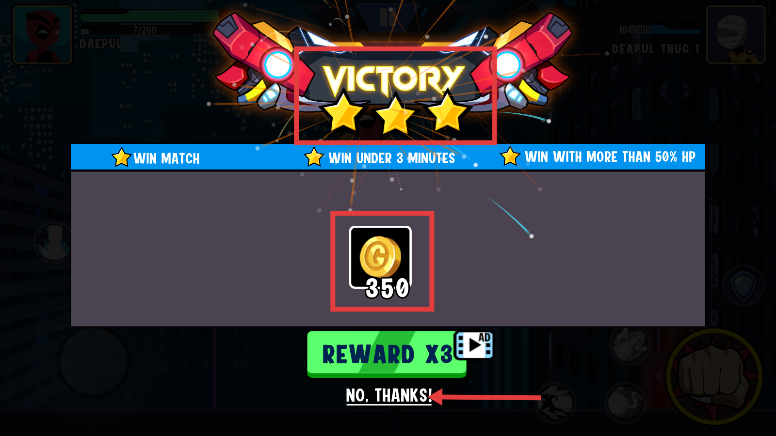 4、胜利后可获得【VICTORY】三星评价与350金币奖励,若不想看广告翻倍奖励,点击【NO,THANKS!】即可。