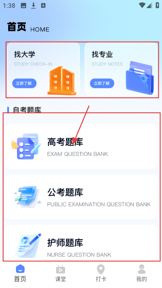 1、首页有【找大学】【找专业】功能,还有【高考题库】等,想刷题选对应题库超方便。